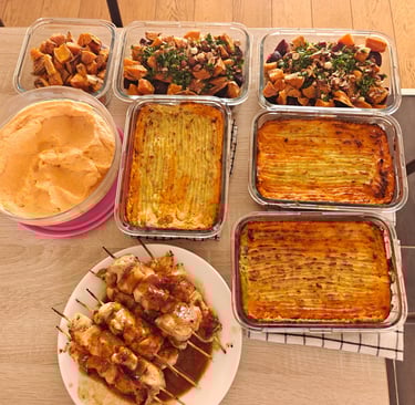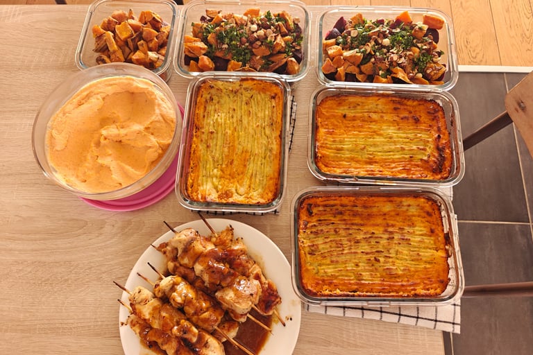 En quelques heures, plusieurs plats sont cuisinés, certaines bases sont préparées et les repas sont organisés pour les jours suivants. On peut ensuite assembler ou réchauffer les plats très rapidement selon les besoins.
